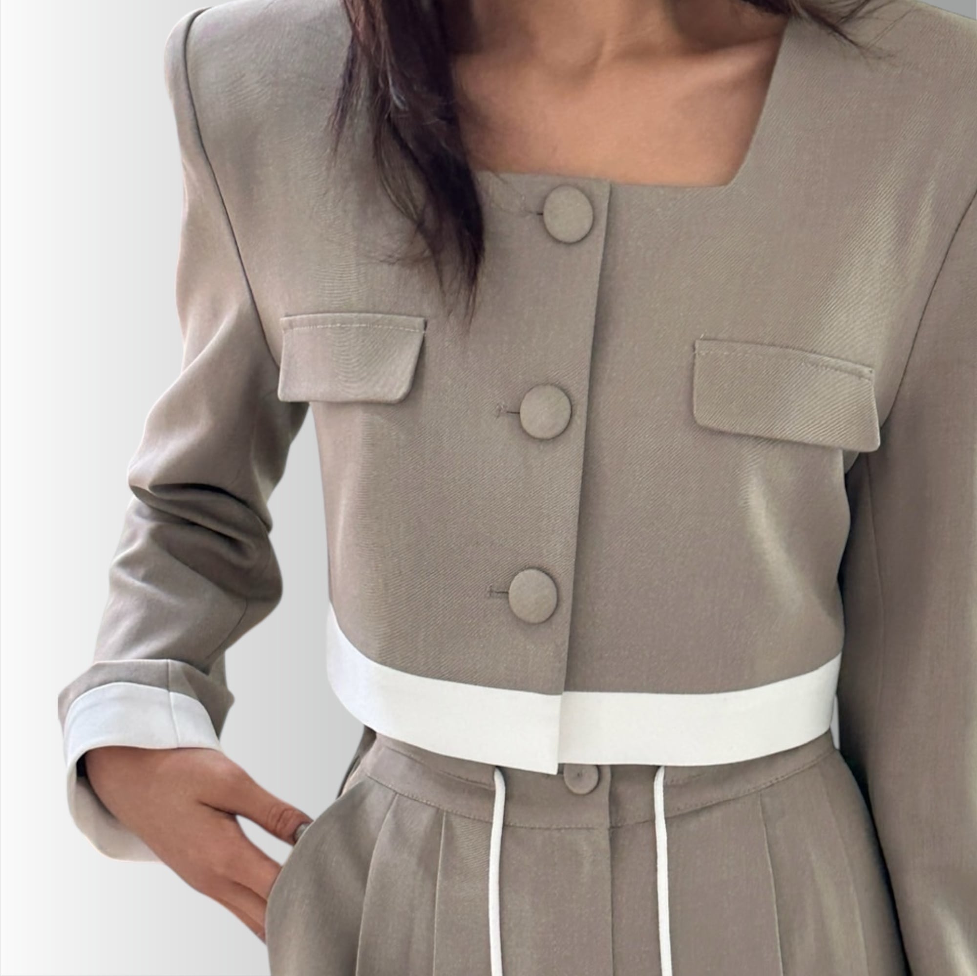 ・クロップジャケットは、トレンド感満載のシルエットが魅力です!軽やかでありながら、しっかりとした素材感が特徴のこのジャケットは、さまざまなスタイルにマッチします。カジュアルなデニムから、フェミニンなワンピースまで、幅広く活躍できるアイテムです。クロップ丈だからこそ、セットでお使いいただけるボトムス(別売り)とのコーディネートも楽しめます!